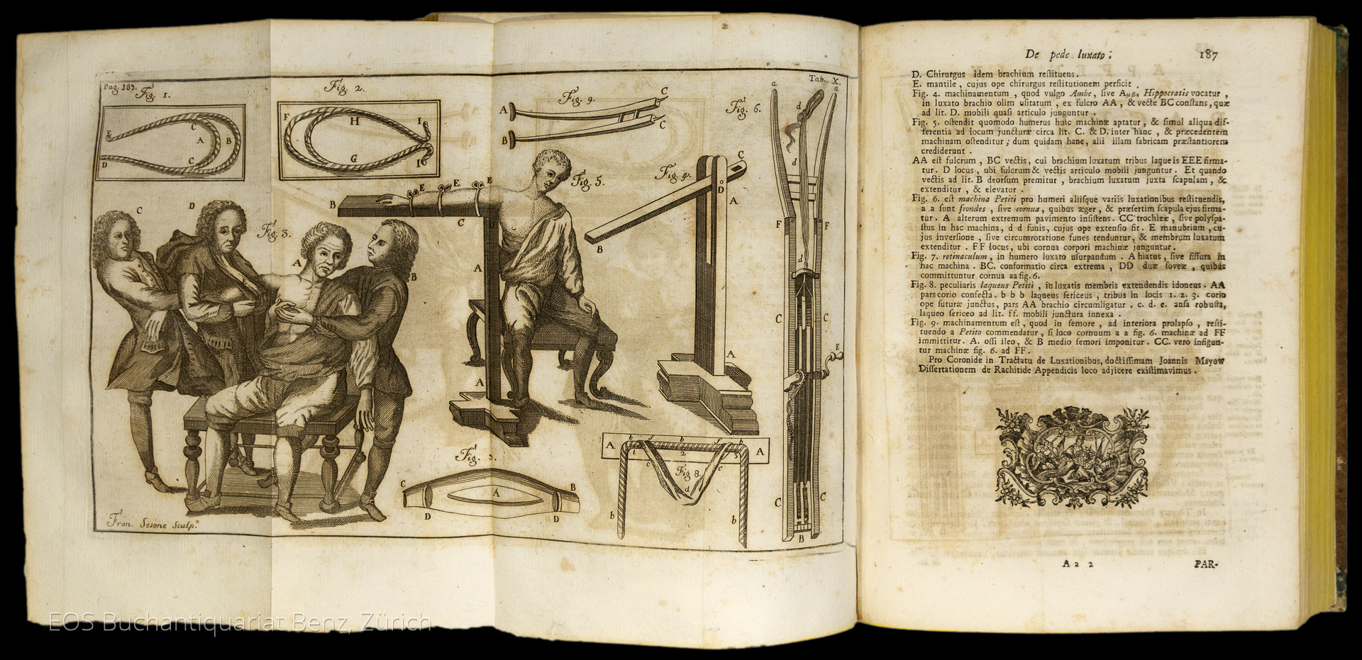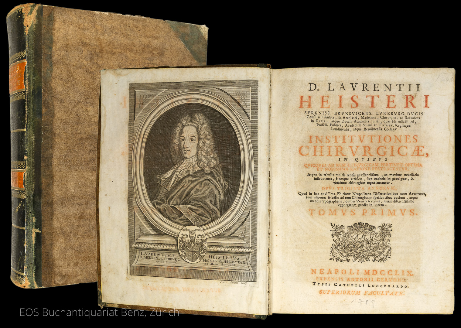 Heister, Lorenz: Institutiones chirurgicae. Neapel, Cathelli Longobardo, 1759. 2 in 1 Band. 4°. (8) Bl., 48 Bl., 296 S.; 263 (1) S. Mit einem Porträt und 21 (dvon 20 gef.) Kupfertafeln. Halblederband der Zeit mit reicher Rückenvergoldung und Rückeschild.