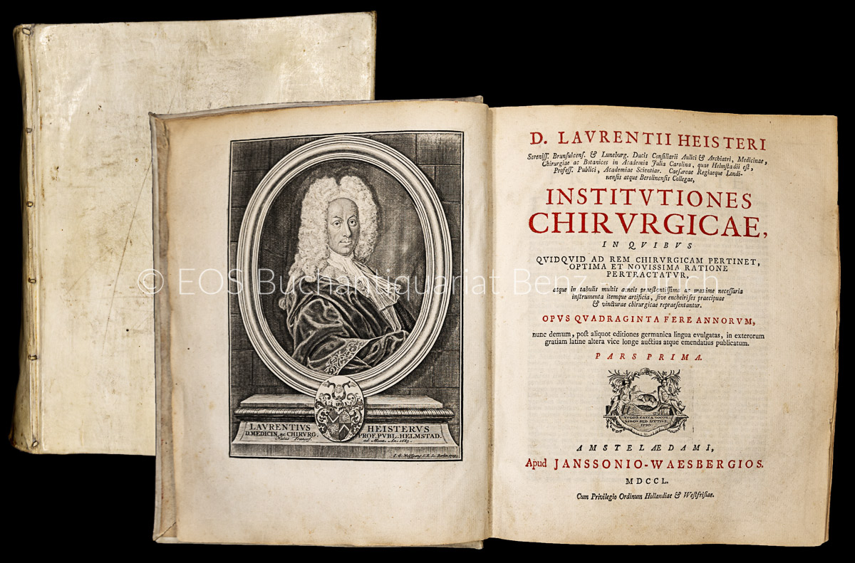 Heister, Lorenz: Institutiones chirurgicae, in quibus quidquid ad rem chirurgicam pertinet, optima et novissima ratione pertractatur… Amsterdam, Janson, 1750, 1747. 2 in 1 Band. 4°. 2 Bl., VII, 568 S. (4) Bl., 8, 1187 S, (53) S. Mit gestochenem Porträt und 40 gefalteten Kupfertafeln. Pergamentband der Zeit.