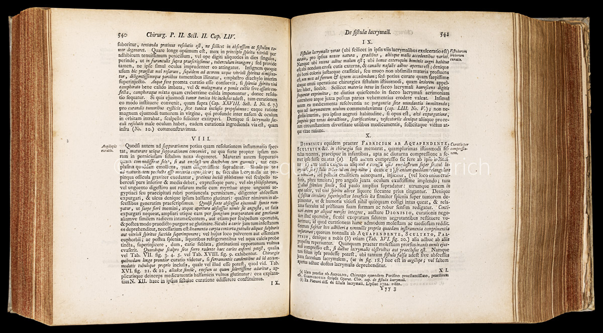 Hirsch-H. 341. – Waller 4263. – Blake 204. – Wellcome III, 237. – Garrison-M. 5576 (für EA von 1718). – Zweite bei Janson gedruckte lateinische Ausgabe nach 1739. Heisters Hauptwerk erschien erstmals 1718 und wurde neben dem Lateinischen in alle wichtigen europäischen Sprachen übersetzt. Die Tafeln sind «of unusal historic interest on account of its instructive illustrations» (Garrison-M.). Die Kupfertafeln zeigen das gesamte damals bekannte Instrumentarium der Chirurgie. – Vorsätze leicht angestaubt und Tafelränder mit kleinen Randeinrissen. Einband fleckig. (Sprache: Lateinisch / Latin)
