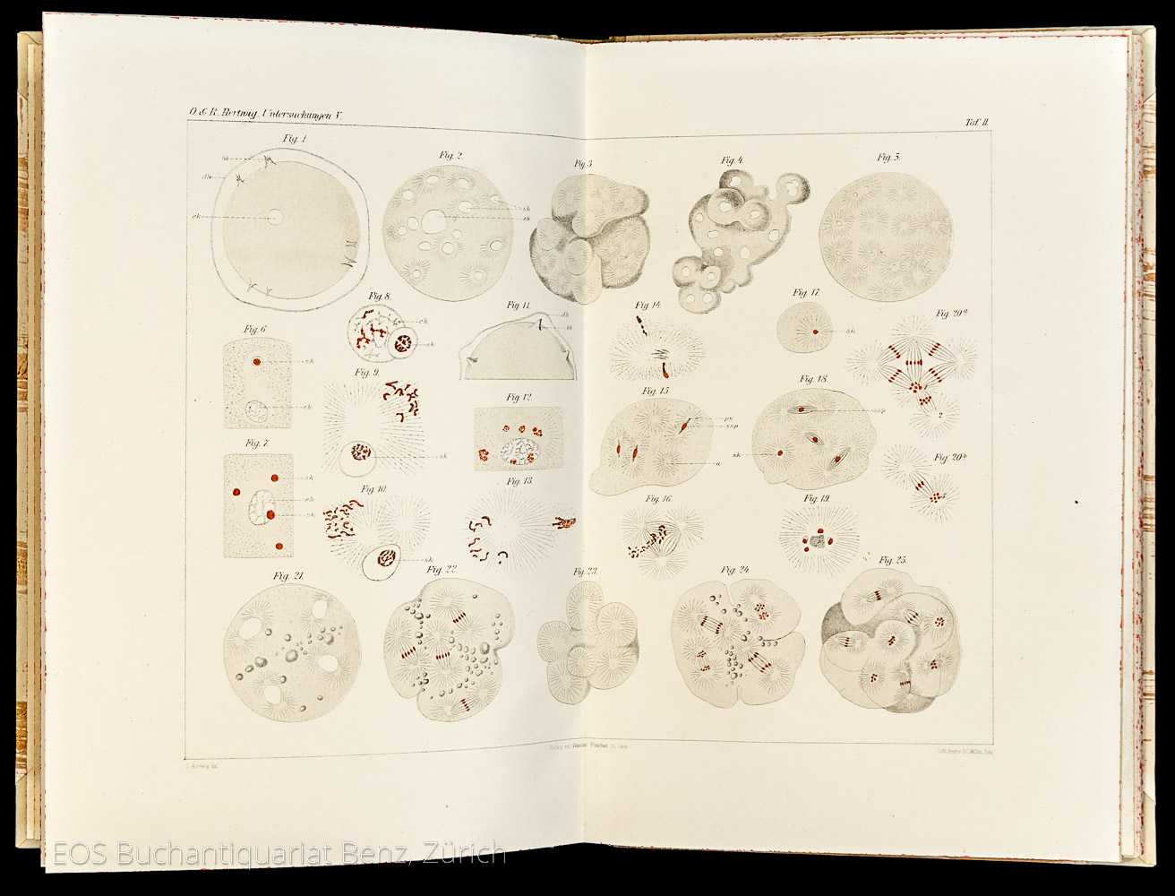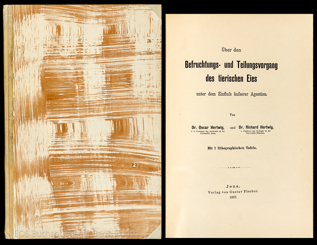 Hertwig, Oscar: Über den Befruchtungs- und Teilungsvorgang des tierischen Eies unter dem Einfluss äusserer Agentien. Jena, Gustav Fischer, 1887. Gr.-8°. (2) Bl., 156 S. Mit 7 lithogr. Tafeln (davon 6 doppelblattgross). Neuer Halbpergamentband.