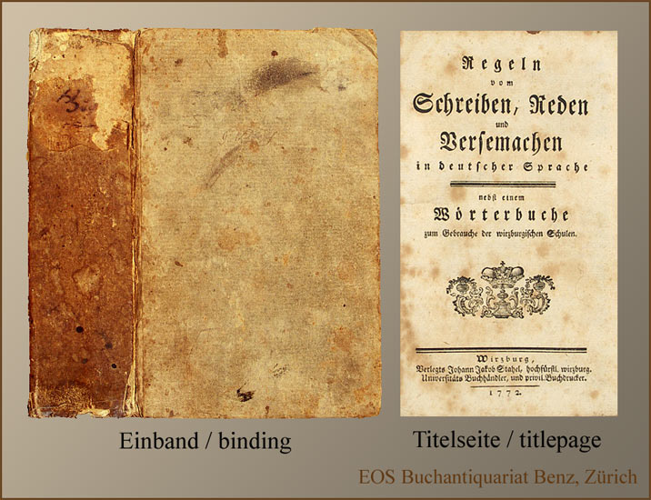 Heyde, Johann Daniel (Hrsg.): Regeln vom Schreiben , Reden und Versemachen in deutscher Sprache – nebst einem Wörterbuche zum Gebrauche der wirzburgischen Schulen. Wirzburg, Joh. Jakob Stahel, 1772 8°. (6), 482 (2) S. Pappband der Zeit (berieben und bestossen).