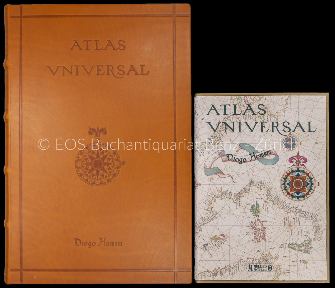 Homem, Diogo: Atlas universal. – (Faks. der Ausg. der russischen Nationalbibliothek Sankt Petersburg von 1565). Barcelona, Moleiro, 2000–2002. 2 Bände. Folio und quart. 331 S. Mit (20) Bl. mit faks. Karten. Leinen- und Lederband in Lederbox.