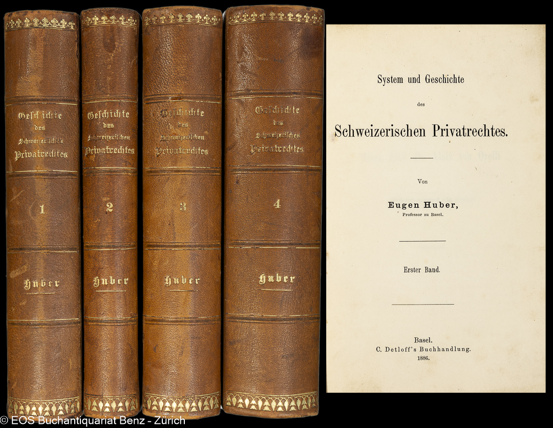 Huber, Eugen: System und Geschichte des Schweizerischen Privatrechtes. Basel, C. Detloff’s Buchhandlung, 1886-1893. 4 Bde. Halbledereinbände mit Rückenvergoldung und -beschriftung.