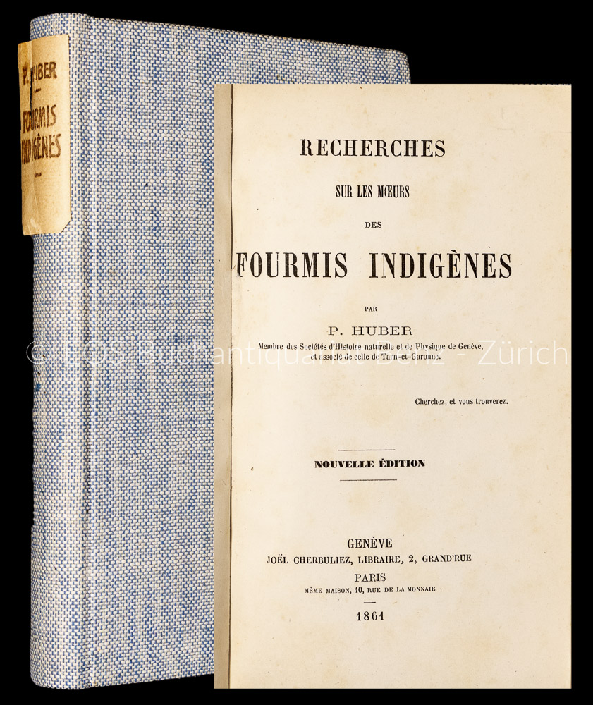 Huber, P(ierre): Recherches sur les moeurs des fourmis indigènes. Paris u. Genf, Cherbuliez, 1861. Nouvelle édition, 8°. XVI, 304 S. Mit 2 gef. Tafeln. Neuer Leinenband.