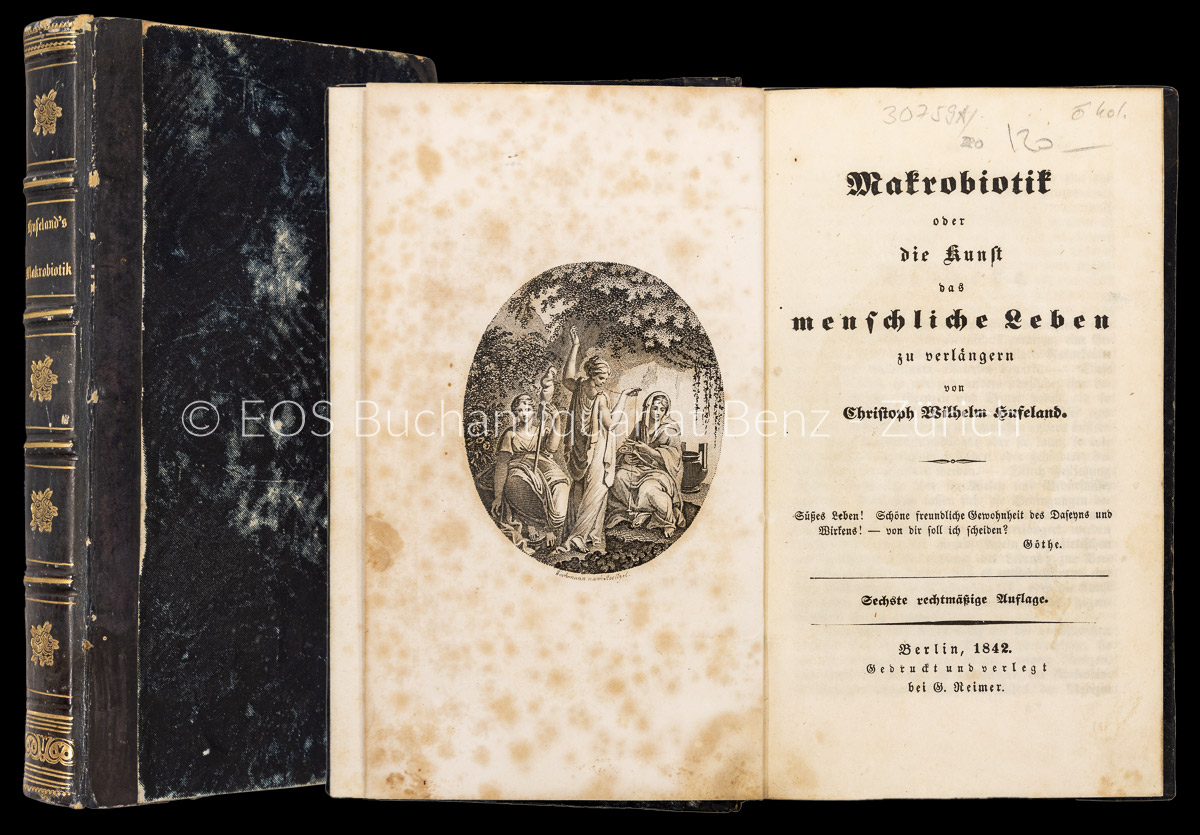 Hufeland, Christoph Wilhelm: Makrobiotik oder die Kunst das menschliche Leben zu verlängern. Berlin, Reimer, 1842. 6. rechtmässige Auflage. 2 Teile in 1 Band. 8°. XVIII, 510 S. Mit Frontisp. Halblederband der Zeit.