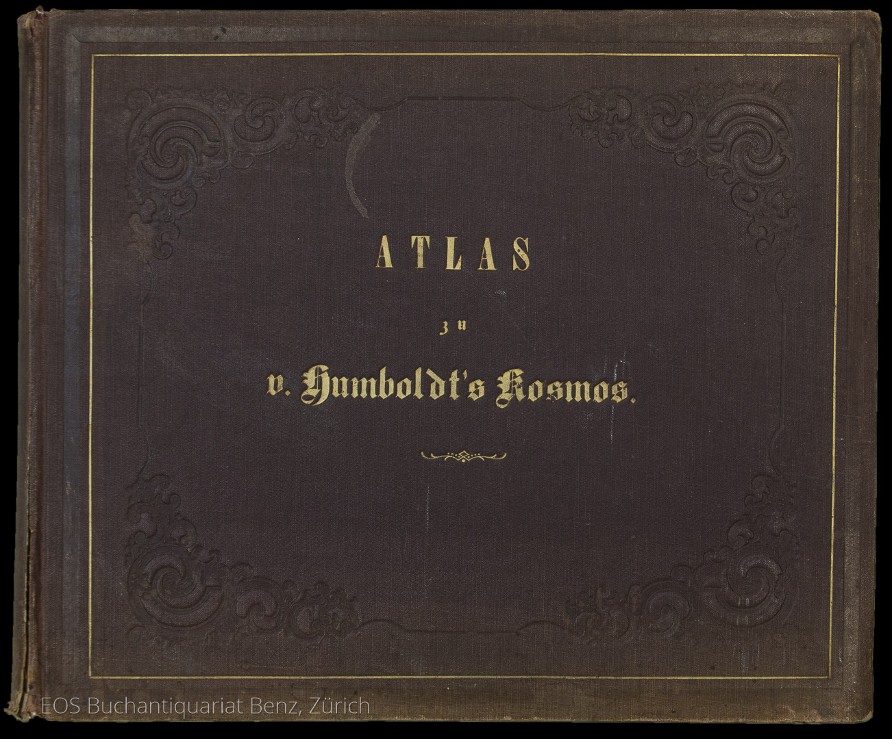 Humboldt, Alexander von: Kosmos. Entwurf einer physischen Weltbeschreibung. – Dabei: Bromme Traugott: Atlas zu Alex. v. Humboldt’s Kosmos. Stuttgart und Augsburg, Cotta und Krais & Hoffmann, 1845–1858. 4 Bände + Atlasband. Quer-4°. XVI, 507 S.; (1) Bl., 535 S.,; (1) Bl., 645 S.; (1) Bl., 690 S., Atlas: (2) Bl., 136 S. Mit 42 Tafeln (davon 39 Karten mit Grenzkolorit). Blind- und goldgeprägte Orig.-Leinenbände.
