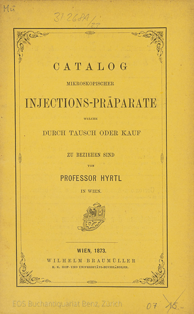 Hyrtl, Joseph: Catalog mikroskopischer Injections-Präparate, welche durch Tausch oder Kauf zu beziehen sind. Wien, Braunmüller, 1873. 8°. 41 S. Mit 3 Textillustr. Orig.-Broschur.