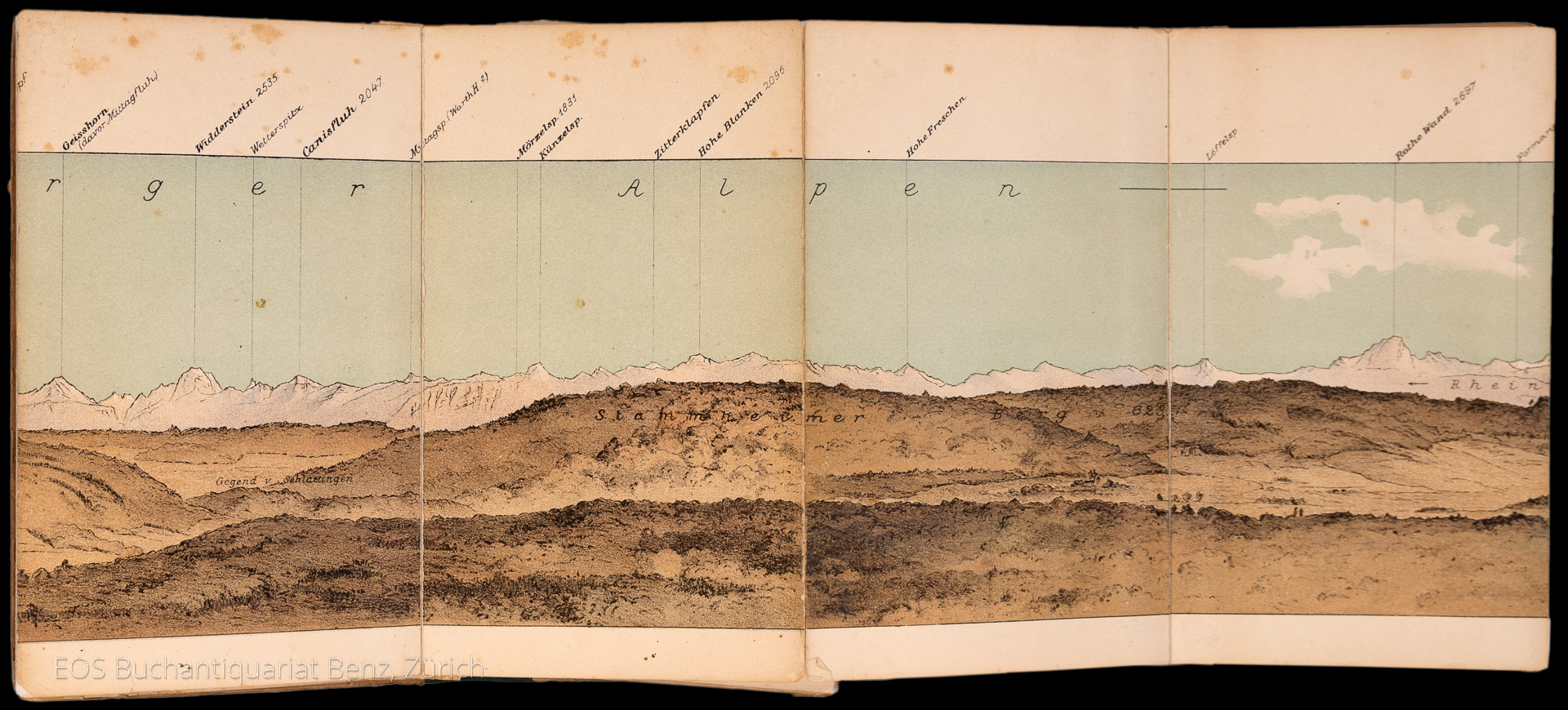 Imfeld, Xaver: Alpenansicht bei Schaffhausen. Im Auftrag des dortigen Verschönerungsvereines aufgenommen und & lithographiert von Xaver Imfeld, Ingenieur von Sarnen. Schaffhausen, Carl Schoch, 1880. 12°. (16 x 385 cm). Farbiges (Chromolithographie) Panorama in 40 Teilen in illustriertem Originalumschlag. Halbleinenumschlag.