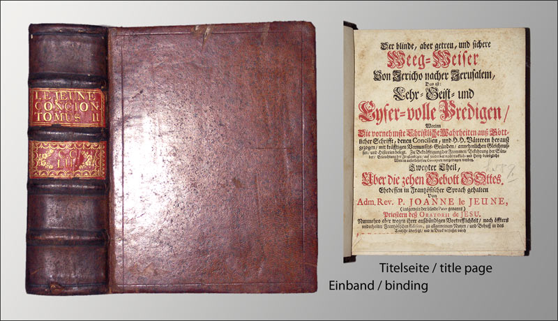 Jeune, Johannes le: Der Blinde, aber getreu und sichere Weeg-Weiser von Jericho naher Jerusalem. Das ist zweyter Curss lehr-geist- und eyfer-voller Mission-Predigen worinn die vornehmste christliche Wahrheiten auss göttlicher Schrifft … Zweyter Theil, uber die zehen Gebott Gottes … in das Teutsche übersetzt und in Druck verfasset durch Laurentius Laux. Konstanz, Johann Ignaz Meyer, 1738. Zweyte Edition. Gross-8°. (1) Bl., (16), 882, (43) S., (1) Bl. Lederbd. d. Zt. auf 4 Bünden mit je 2 goldgepr. Rückenschildern (bestossen u. stärker berieben, Rücken an Kopf u. Fuss mit Wurmlöchern).