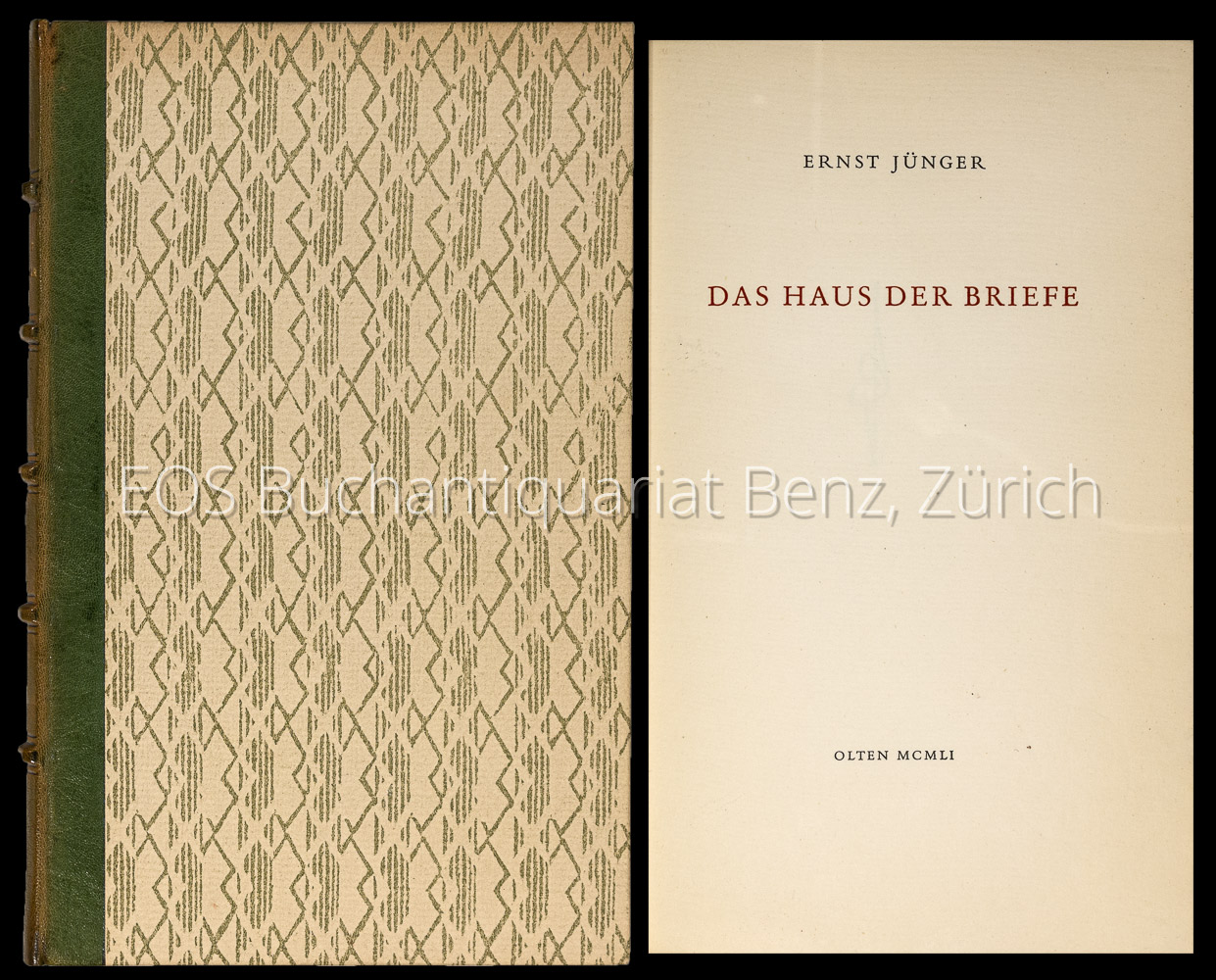 Jünger, Ernst: Das Haus der Briefe. Olten, Vereinigung Oltener Bücherfreunde, 1951. 8°. (2) Bl., 58 (6) S., (2) Bl. Orig.-Halblederband.