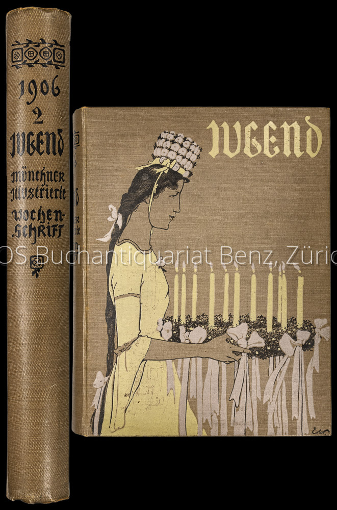 Jugend. Münchner illustrierte Wochenschrift für Kunst und Leben. München, Verlag der Münchner Jugend, 1906. 2 Bände. 4°. 1149 S. und einige nicht nummerierte Bl. Mit zahlr. zum Teil farbigen und ganzs. Illustrationen. Farb. illustr. Orig.-Leinenbände.