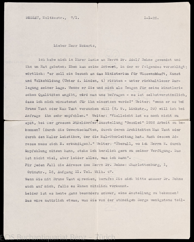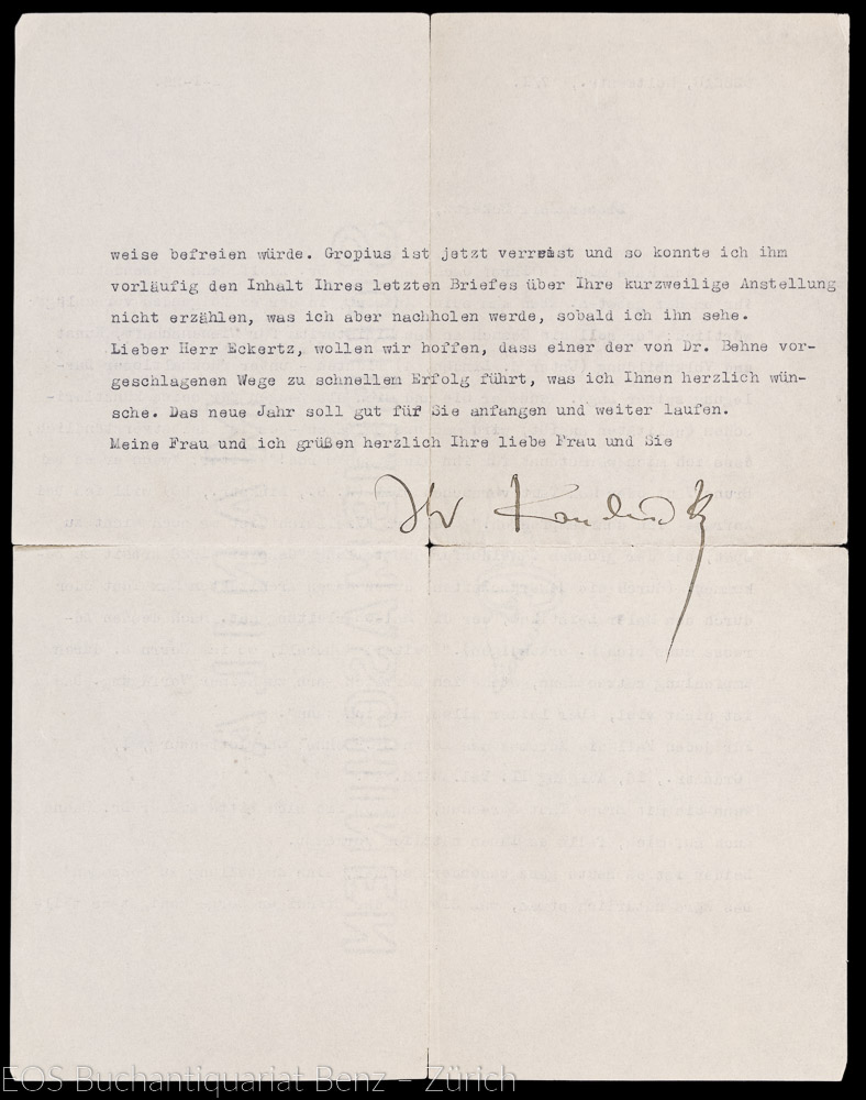 Brief an Waldemar Eckertz (1878-1947), deutscher Maler und Grafiker. – Eckertz sucht eine Anstellung und Kandinsky möchte ihm dabei helfen. Er wendet sich dabei an den deutschen Archidekt Adolf Behne (1885–1948), der ihm einige Kontakte angibt, wo sich Eckertz bewerben könnte. – Papier mit Einriss. (Sprache: Deutsch / German)