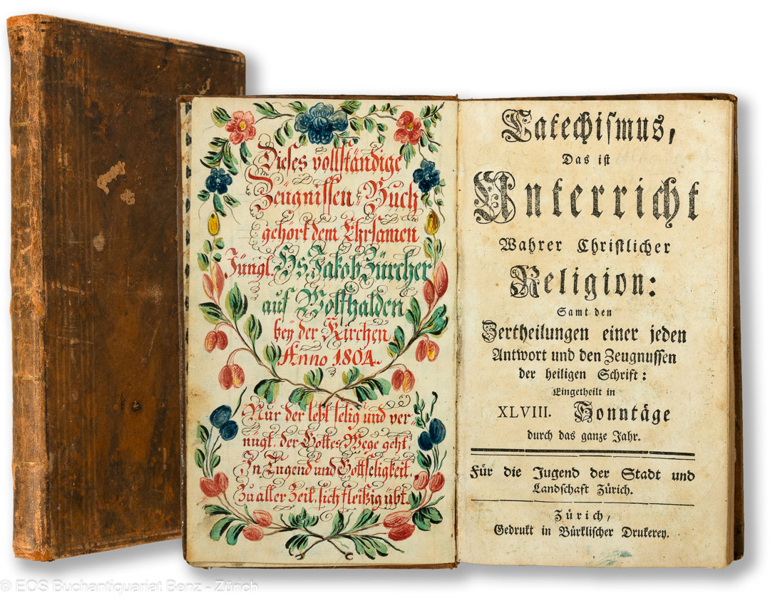 Katechismus, das ist Unterricht wahrer christlicher Religion: Samt den Zertheilungen einer jeden Antwort und den Zeugnussen der heiligen Schrift: Eingetheilt in XLVIII Sonntage durch das ganze Jahr. Für die Jugend der Stadt und Landschaft Zürich. Zürich, Gedruckt in Bürklischer Drukerey, 1796. 8°. 224 S. Mit einem farb. illustr. ganzs. Besitzereintrag. Goldgeprägter Lederband der Zeit mit dreiseitigem Goldschnitt.