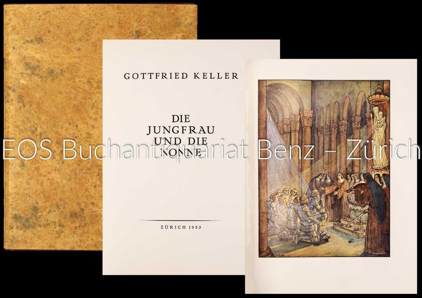Keller, Gottfried: Die Jungfrau und die Nonne. Zürich, Buchdruckerei Berichthaus, 1923. Gr.-4°. 2 Blatt, 10, 1 Seiten. Mit 6 montierten Tafeln mit farbigen Illustrationen von Hans Caspar Ulrich. Original roter Ledereinband mit Deckel- und dreifacher Seitenkantenvergoldung. In Pappchemise und Schuber.