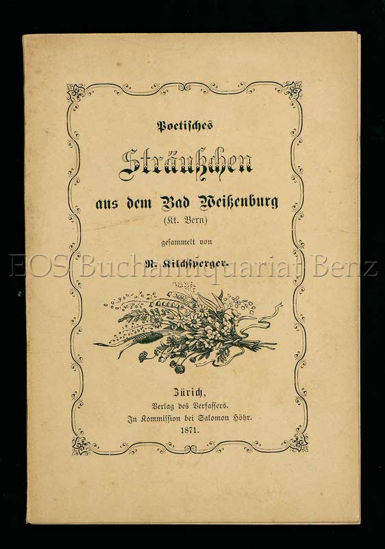 Kilchsperger R(udolf): Poetisches Sträusschen aus dem Bad Weissenburg (Kt. Bern) gesammelt von R. Kilchsperger. Zürich, Verlag des Verfassers, in Kommission bei Salomon Höhr, 1871. 8°. V, (2), 78 S. Illustr. Orig.-Broschur.