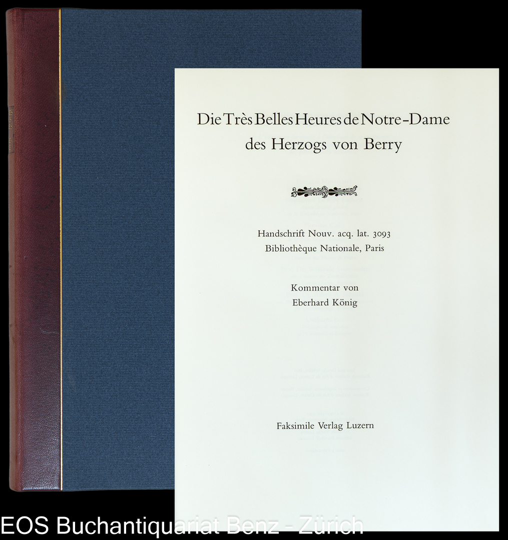 König, Eberhard: Les très belles heures de Notre-Dame de Jean, duc de Berry. – Commentaiie / Kommentar. Manuscrit nouv. acq. lat. 3093, Bibliothèque Nationale, Paris. Luzern, Faks.-Verl., 1992. 254 S. Mit schwarz/weiss Illustrationen. Halblederband.