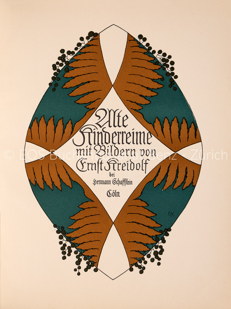 Kreidolf, Ernst: Alte Kinderreime. Köln, Hermann & Friedrich Schaffstein, (1905). 4°. (32) S., (1) S. (Anzeigen). Mit 15 farb., ganzs. Illustr. u. 1 Schlussvignette von Ernst Kreidolf. Farb. illustr. Orig.-Pappbd. mit beschädigtem Schutzumschlag. Minimal berieben. Sehr gutes Exemplar.