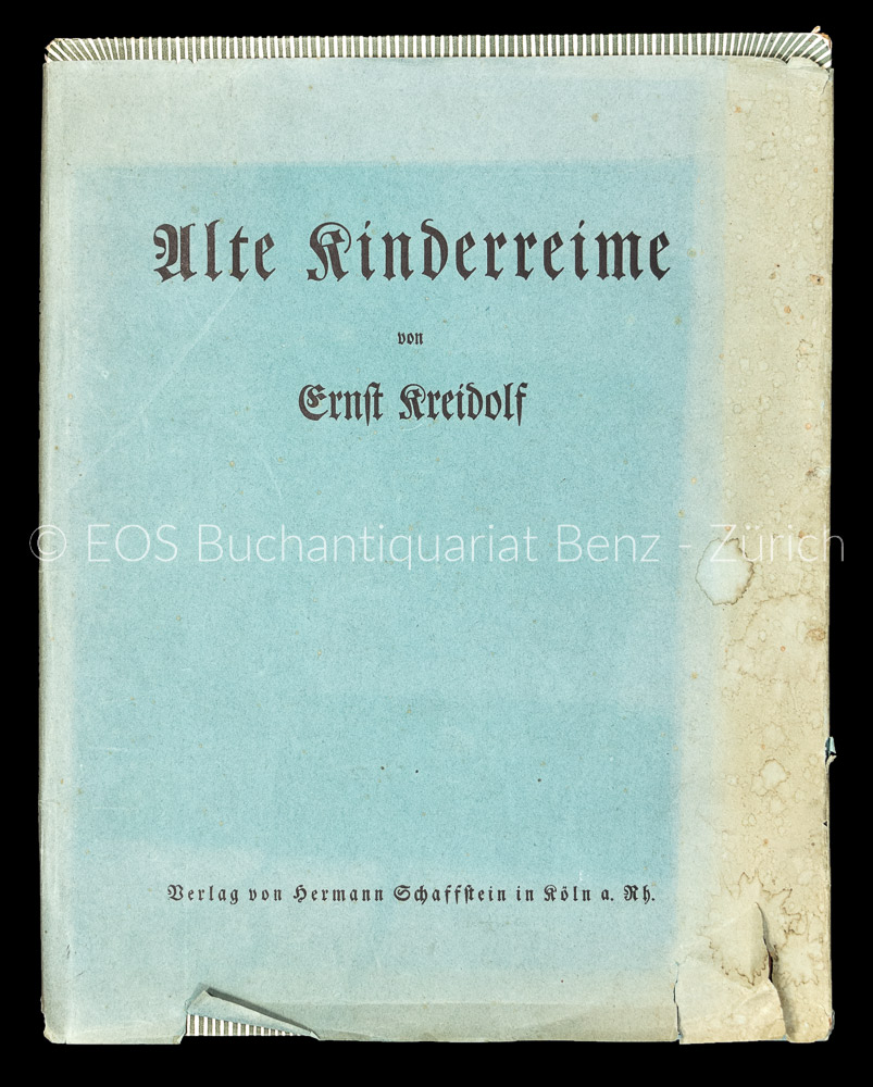 Kreidolf, Ernst:  Alte Kinderreime. Köln, Hermann & Friedrich Schaffstein, (1905). 4°. (32) S., (1) S. (Anzeigen). Mit 15 farb., ganzs. Illustr. u. 1 Schlussvignette von Ernst Kreidolf. Farb. illustr. Orig.-Pappbd. mit beschädigtem Schutzumschlag. Minimal berieben. Sehr gutes Exemplar.