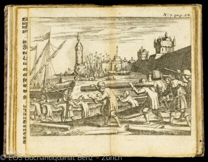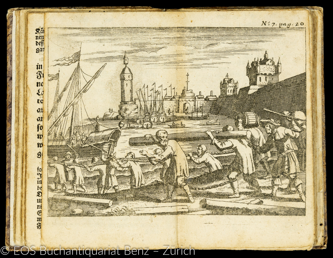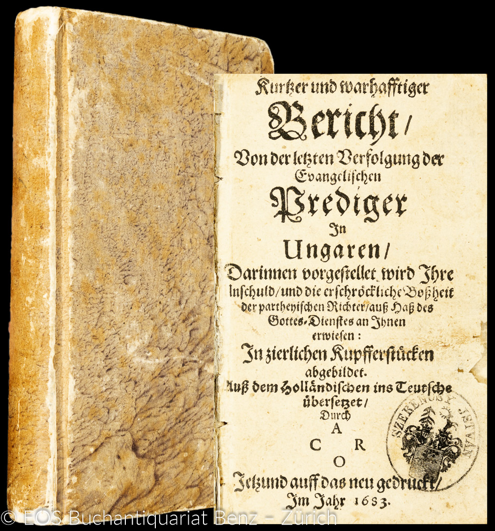 Kurtzer und warhafftiger Bericht, von der letzten Verfolgung der Evangelischen Prediger in Ungaren, Darinnen vorgestellet wird Ihre Unschuld und die erschröckliche Bossheit der partheyischen Richter auss Hass des Gottes-Dienstes an Ihnen erwiesen in zierlichen Kupferstücken abgebildet. Aus dem Holländischen ins Teutsche übersetzt durch A C R O. – (II:) Nothwendige Gedancken Der Evangelischen Prediger in Teutsch-Land über denen Exulanten auss Ungarn, kürzlich entworffen und auss dem Ungarischen ins Teutsche übersetzt, von einem der nicht weit davon gewest. Aufs neu gedruckt im Jahr 1683. O.O., 1683. Jetzt und aufs neu gedruckt. 12°. (15), 69 S.; 58 (recte 56) S. Mit 7 doppelblattgrossen Kupfertafeln. Pappband der Zeit mit Kleisterpapierbezug.