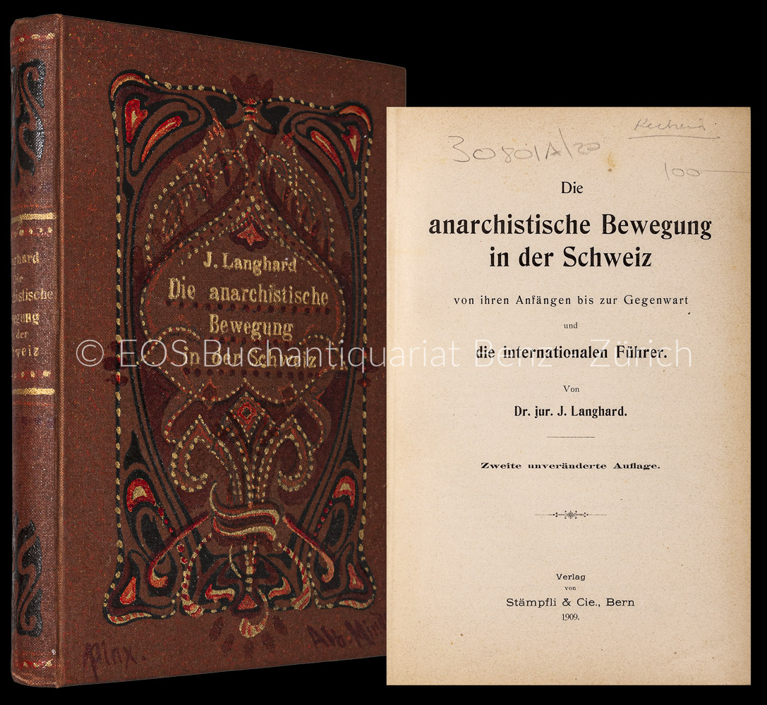 Langhard, Johann: Die anarchistische Bewegung in der Schweiz von ihren Anfängen bis zur Gegenwart und die internationalen Führer. Bern, Stämpfli, 1909. 2., unveränderte Auflage. 8°. VIII, 492 S. Goldgepr. Orig.-Leinenband.