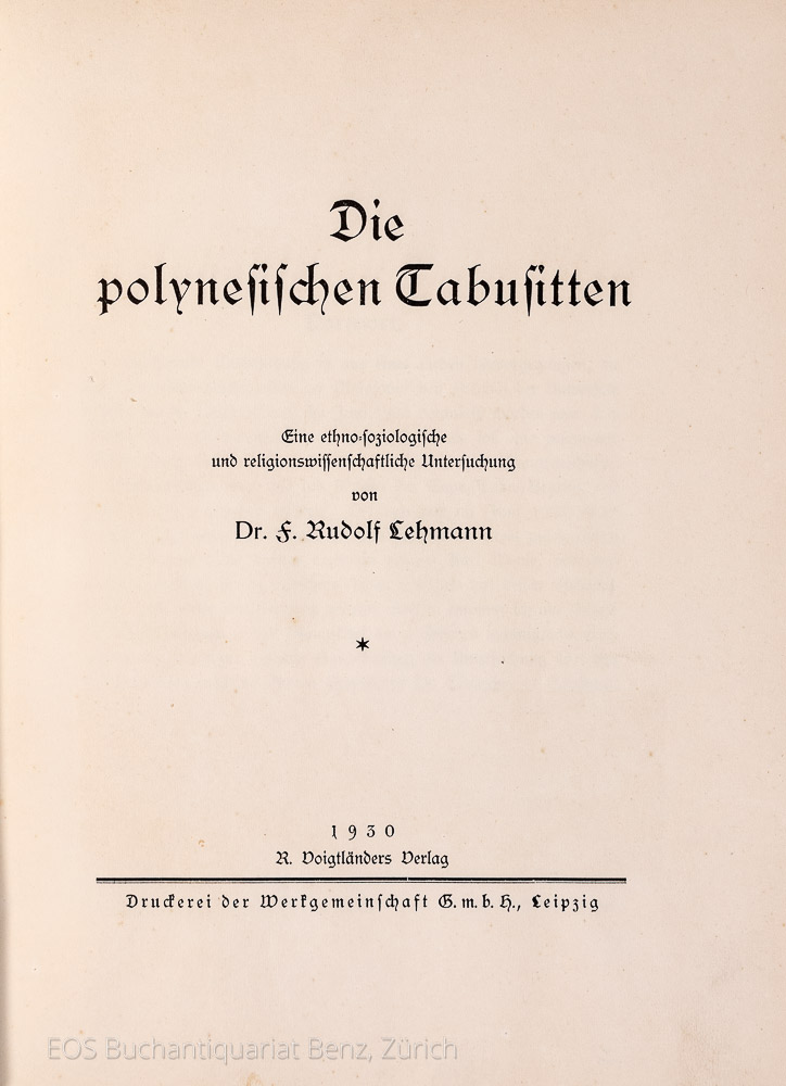 Lehmann, Rudolf: Die polynesischen Tabusitten. Eine ethno-soziologische und religionswissenschaftliche Untersuchung. Leipzig, Voigtländers Verlag, 1930. Gr.-8°. VII, 344 S. Orig.-Leinenbände.