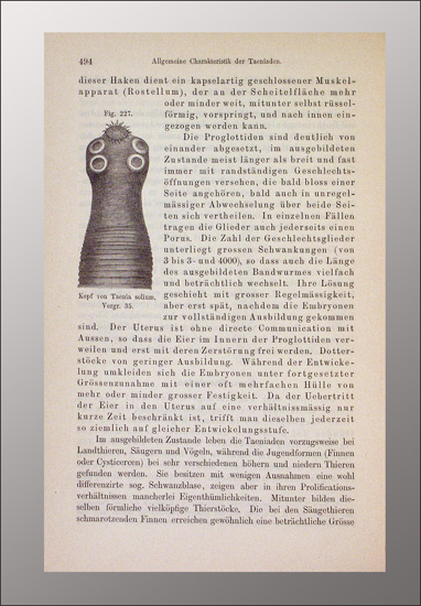 Leuckart, Rudolph: Die Parasiten des Menschen und die von ihnen herrührenden Krankheiten. Ein Hand- und Lehrbuch für Naturforscher und Aerzte. Leipzig, Winter, 1879-1901. 1. Band I. + II. Abtheilung (alles Erschienene) in 2 Bänden. 8°. XXXI, 1000 S.; XXXI, IV, IX, VIII, 897 S. Mit 780 Holzschnitten im Text. Schlichte Bibliothekshalbleinwandbände mit handschriftlichen Rückentiteln.