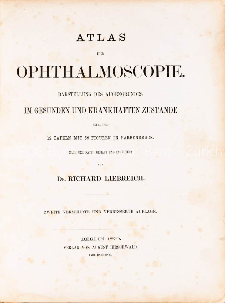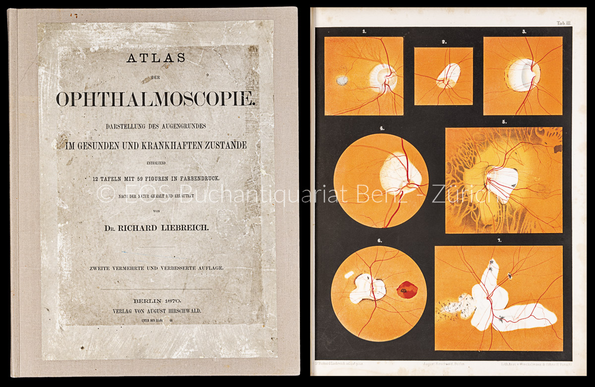 Augenheilkunde. – Liebreich, Richard: Atlas der Ophtalmoscopie. Darstellung des Augengrundes im gesunden und krankhaften Zustande, enthaltend 12 Tafeln mit 59 Figuren in Farbendruck. Nach der Natur gemalt und erläutert. Berlin, Hirschwald, 1870. Folio. VI, 31, VII-VIII S. Mit 12 lithogr. Tafeln (1 gef.). Neuer Leinenband mit dem montierten Orig.-Umschlag.