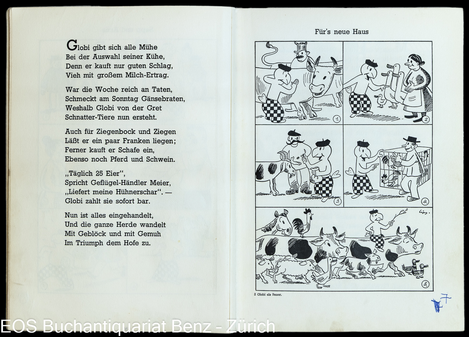 Lips, Robert: Wie Globi Bauer wurde. Zürich, Globi-Verlag, 1941 1.-15. Tausend. Gr.-8°. (79) S., (1) S. (Verlagsanzeigen). Mit Bildgeschichten von Robert Lips.