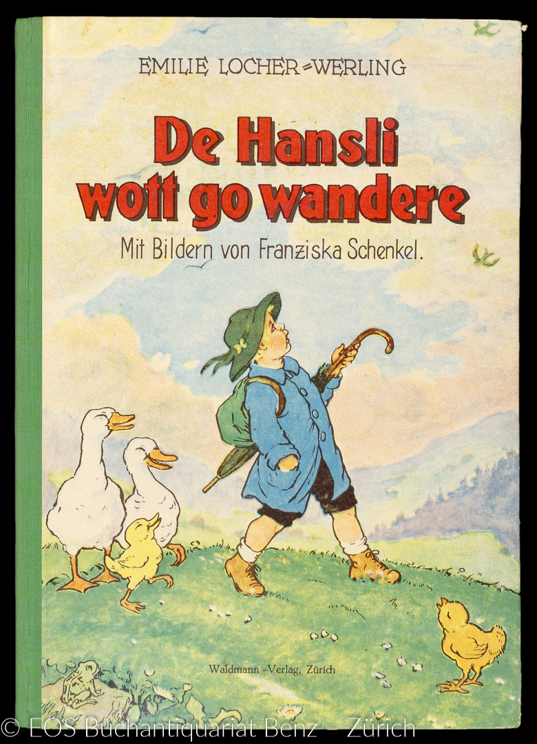 Locher-Werling, Emilie: De Hansli wott go wandere. Zürich, Hans Waldmann, (um 1930). 4. Auflage. 4°. (26) S. Mit 12 farb. Illustr. von Franziska Schenkel. Farbig illustrierter Original-Halbleinenbd.