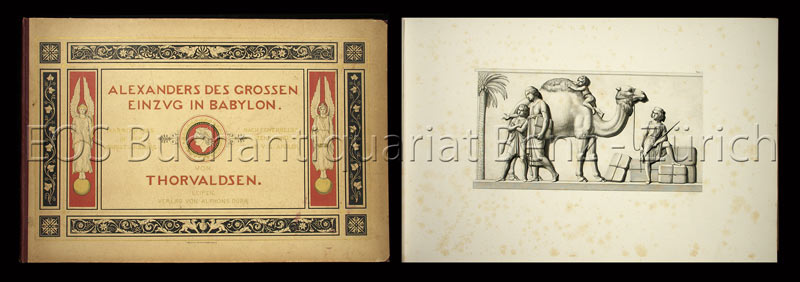 Lücke, Hermann: Der Einzug Alexander des Grossen in Babylon. Marmorfries von B. Thorwaldsen. Nach Zeichnungen von F. Overbeck, in Kupfer gestochen von S. Amsler. Neue Ausagabe. Leipzig, Alphons Dürr, 1870. Quer-folio. 14 S. Mit 21 Stahlstichtafeln. Farb. illustr. Halbleinenband.