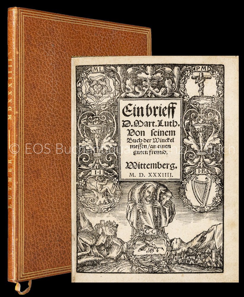 VD 16 L 4178 mit den Erkennungsmerkmalen auf Blatt AIIa, Zeile 19 «durch lesen/» und im Kolophon «Gedruck …» . – Benzing 3093 (Variante B1). – Claus/Clegg, Ergänzungen, 3093. – Henning, Verzeichnis der Luther-Drucke, 846. – Cf. Stuttgarter Antiquariat Kocher-Benzing, Gilhofer und Hans Horst Koch, Kat. Martin Luther (1972), Nr. 292. – Das Werk trägt die Widmung «Dem gestrengen und Vesten N. meinem besondern herrn und gunstigen freunde». Die Schrift beieht sich auf Reaktionen, welche Luthers 1533 erschienenes Werk «Von der Winkelmesse …» ausgelöst hatte. «Die Gegner Luthers, insbesondere Fürst Johann von Anhalt, hatten Luther … verdächtigt, sich den Sakramentieren und Schwärmern um Zwingli zu nähern. (Er) bezieht … hier eindeutig Stellung und legt nochmals den Unterschied zwischen der ‹Messe› und dem ‹Sakrament› dar.» (Kocher-Benzing). – Die schöne Titeleinfassung zeigt den guten Hirten und weist in Medaillons die Initialen von Martin Luther, Philipp Melanchthon, Justus Jonas, Caspar Cruciger und Johannes Bugenhagen auf. Sie wurde einst als ein Werk Cranachs angesehen, dann auch Georg Lemberger (um 1495 – um 1540), der für Lufft arbeitete, zugeschrieben, wie ein hs. Eintrag eines Vorbesitzers nahe legt. Kocher-Benzing nennt H. Zimmermann (Buchillustr. S. 72), der ihn dem Monogrammisten MS, dem Illustrator der ersten Lutherbibel von 1524, zuschreibt. – Oberer Rand etwas knapp beschnitten, sonst sehr gutes Exemplar. (Sprache: Deutsch / German)