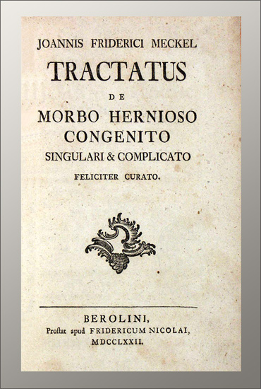 Meckel, Johann Friedrich (d.Ä.): Tractatus de morbo hernioso congenito singulari & complicato feliciter curato. Berlin, Friedrich Nicolai, 1772. 8°. 2 n.n. Bl., 148 S. Halblederband der Zeit mit rotem, goldgeprägtem Rückenschild und wenig Rückenvergoldung.