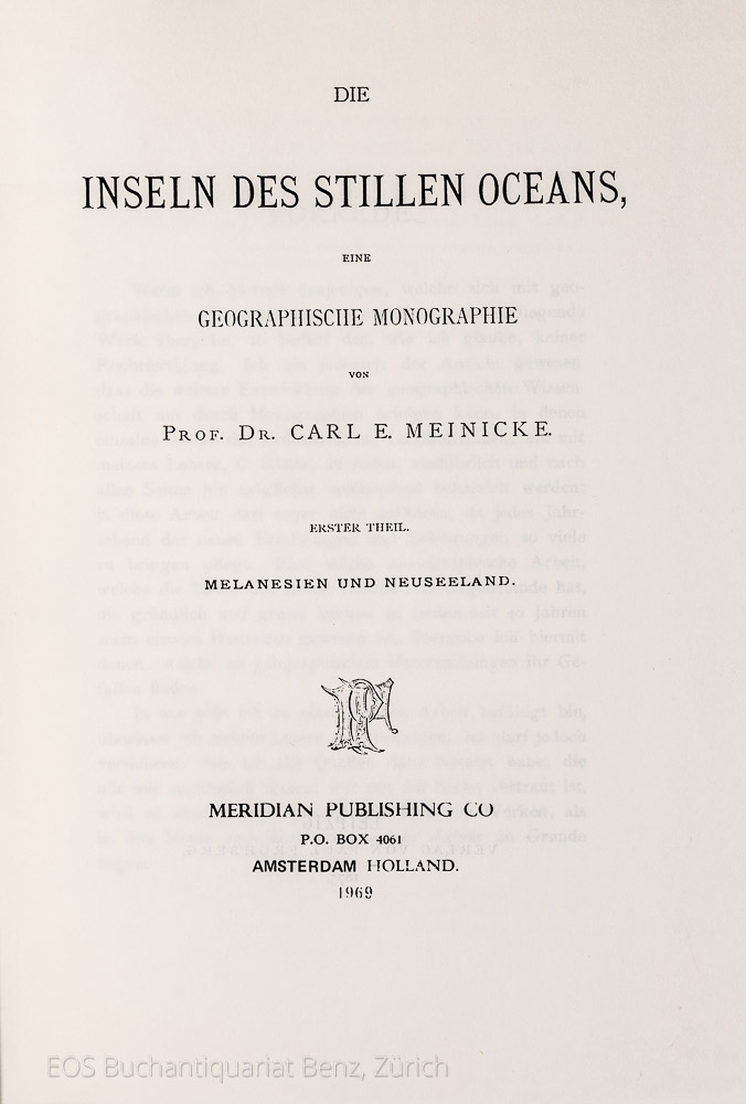 Meinicke, Carl E.: Die Inseln des stillen Oceans, eine geographische Monographie. – Erster Teil: Melanesien und Neuseeland. – Zweiter Teil: Polynesien und Mikronesien. Amsterdam, Meridian Publishing, 1969. 2 Bände. 8°. VIII, 382 S.; VI, 487 S. Orig.-Leinenbände.