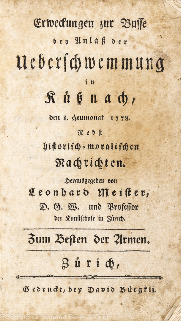 Meister, Leonhard: Erweckungen zur Busse bey Anlass der Ueberschwemmung in Küssnach, den 8. Heumonat 1778. Nebst historisch-moralischen Nachrichten. Zürich, gedruckt bey David Bürgkli, 1778. 8°. 85 S. Broschur der Zeit.