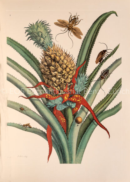 Merian, Maria Sibylla: Histoire naturelle des plantes & insectes de Surinam. / Naturgeschichte der Pflanzen & Insekten … Observés et peints d’après nature par Maria Sibylla Merian. Lausanne, Jean Genoud, 1984–90. 7 (von 8) Mappen. Folio. Je 3–4 Bogen. mit je 2 farb. Tafeln.