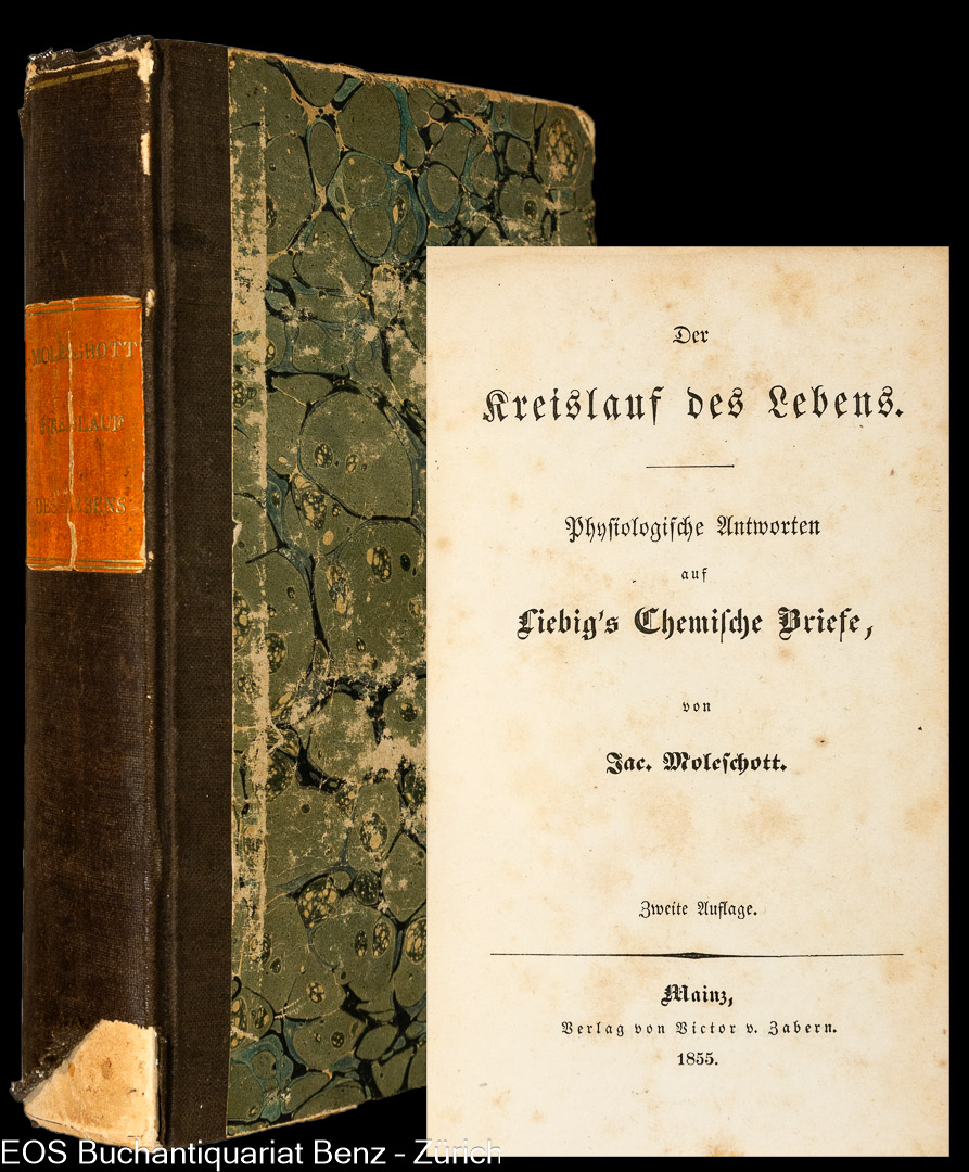 Moleschott, Jakob: Der Kreislauf des Lebens. Physiologische Antworten auf Liebig’s Chemischen Briefe. Mainz, Victor von Zabern, 1855. Dritte, verm. und verb. Auflage. 8°. VI, 507 S. Halbleinenband der Zeit.