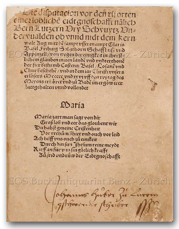 VD16 M 7033. – Goedeke II, 219, 51a. – Haller III, 267. – German STC 61. – Erste Ausgabe der Protokolle der Badener Disputation von 1526, die vom Franziskaner Thomas Murner (14751537) ein Jahr später in Luzern herausgegeben wurden. Mit einer handschriftlichen Signatur von Johann Huber, dem leitenden Notar der Streitgespräche «Johannes Huber zu Luzern geschr… J. Huber …». Die 12 katholischen Orte organisierten im Zuge der Reformation in Zürich diese Disputation mit Johannes Eck, dem Wortführer der Katholiken und mit Johannes Oekolampad für die reformierte Seite, der für Zwingli einsprang, da dieser sich weigerte daran teilzunehmen, der aber trotzdem Einfluss auf die Gespräche nahm, indem er sich durch die beiden Landsleute Thomas Platter und Hieronymus Zimmermann über deren Verlauf informierte und seinerseits Antworten an Oekolampad übermitteln liess. «Zwar ging die kath. Partei siegreich hervor, doch hatte die Disputation u. a. zur Folge, dass Basel und Bern der Reformation fortan günstiger gestimmt waren» (HLS – Irena Backus). – Es fehlt das leere Blatt d2. Über ca. 30 Seiten am oberen Innenfalz mit hinterlegten Papierverlusten, zum Teil mit Textverlust. Der obere Rand knapp beschnitten (12 Blatt mit Textverlust). Durchgehend gebräunt und etwas stock- und fingerfleckig. Die angeplatzten Einbandgelenke restauriert. (Sprache: Deutsch / German)