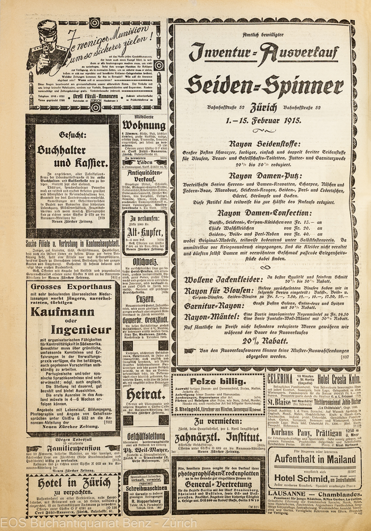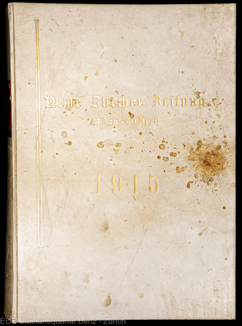 Tages-Zeitung – Neue Zürcher Zeitung und schweizerisches Handelsblatt. Zürich 1915. 136. Jahrgang (31.01.1915 – 30.04.1915) über 1000 Seiten, davon etwa 25% mit Annoncen. Pergament-Einband mit goldverzierter Schrift.
