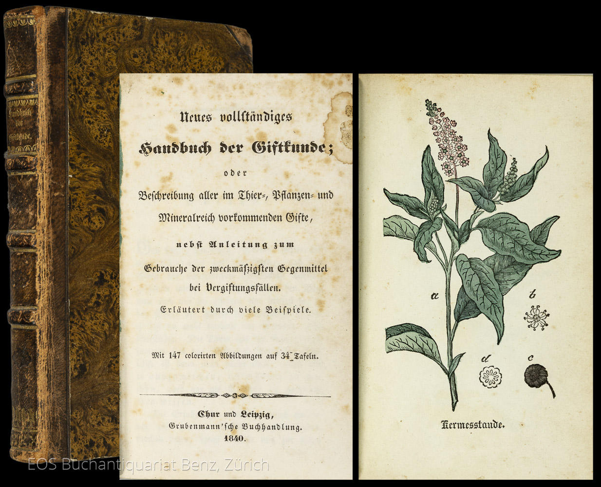 Neues vollständiges Handbuch der Giftkunde, oder Beschreibung aller im Thier-, Pflanzen- und Mineralreich vorkommenden Gifte, nebst Anleitung zum Gebrauche der zweckmässigsten Gegenmittel bei Vergiftungsfällen. Erläutert durch viele Beispiele. Chur und Leipzig, Grubenmann’sche Buchhandlung, 1840. 8°. X, 214 S., (1) Bl. Mit 34 lithogr. Tafeln mit 147 kol. Abb. Halblederband der Zeit mit Rückenvergoldung.