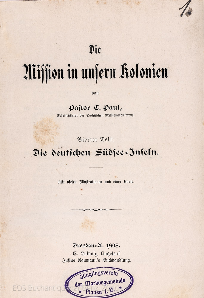 Paul, Carl: Die Mission in unsern Kolonien. Vierter Teil: Die deutschen Südsee-Inseln. Dresden, E. Ludwig Ungelenk, 1908. 8°. (2) Bl., 260 S. Mit zahlr. Abb. im Text und 1 gef. Karte. Späterer Halbleinenband.