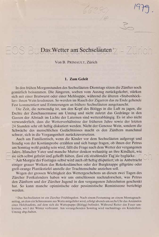 Primault, Bernard: Das Wetter am Sechseläuten. O. O., 1979. 8°. S. 222-246. Ohne Umschlag.