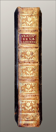 Quesnay, François: Traité de la gangrene. Paris, Veuve d’Houry, 1764. 8°. 4 n.n. Bl., 507 S. Lederband der Zeit mit rotem Rückenschild und floraler Rückenvergoldung.