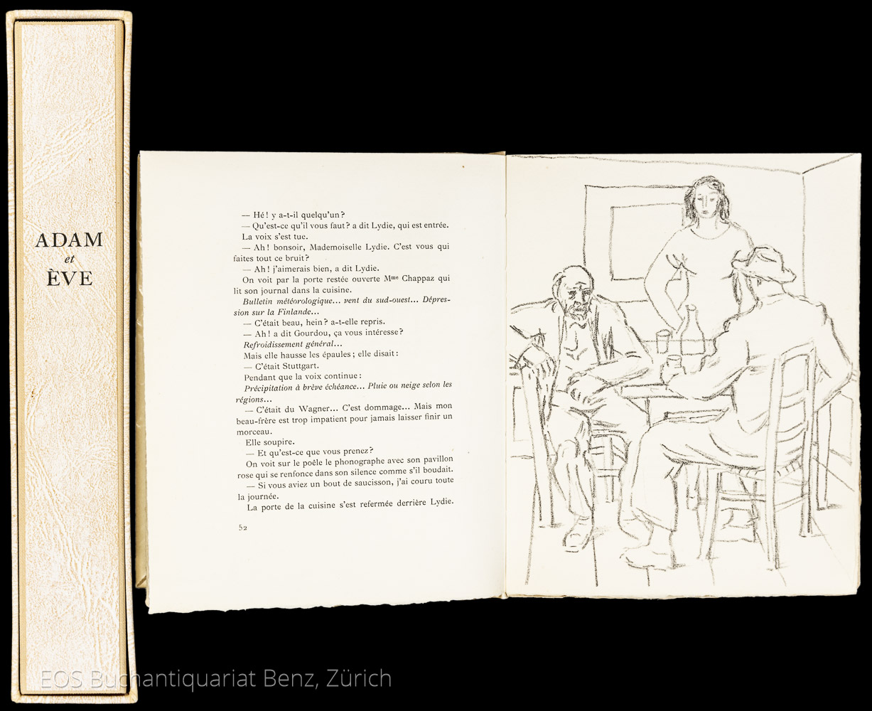 Gimmi. – Ramuz, Charles-Ferdinand:  Adam et Ève. Lithographies de (Wilhelm) Gimmi. Genève und Paris, Éditions des Trois Collines, 1949. 4°. 227 S. (1) Bl. Mit Illustrationen von Gimmi. Original-Broschur mit Pergamin-Umschlag, in Original-Karton-Chemise und Schuber.