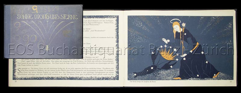 Recklinghausen, Lore von: Sonne, Mond und Sterne. Bilder und Geschichten. Berlin, Wegweiser-Verlag, 1925. Quer-4°. 32 S. Zahlr. farb. Illustr. von Lore von Recklinghausen Orig.-Halbleinenband. In sehr gutem Zustand.