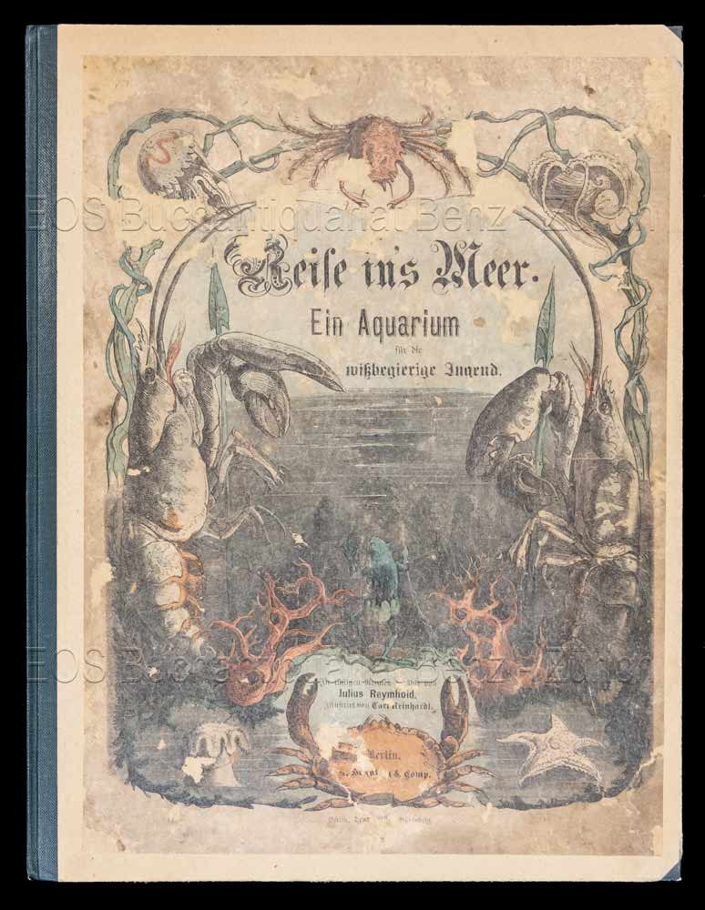 Reinhardt, Carl August:  Die Reise in’s Meer. Ein Aquarium für die wissbegierige Jugend. In lustigen Reimen erzählt von Julius Reymold (Pseudonym). Berlin, A. Hoffmann, (1869). 4°. 52 S. Mit 12 kol. Holzstich-Tafeln und Textillustr. von Carl Reinhardt. Neuer Halbleinenband, der alte vordere Umschlag montiert.