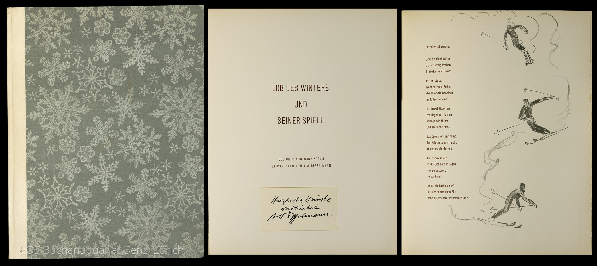 Diggelmann. – Roelli, Hans: Lob des Winters und seiner Spiele. Gedichte von Hans Roelli. Zeichnungen von A. W. Diggelmann. Zürich, Berichthaus, 1961. Kl.-Folio. (4), (30) Bl. Mit 23 Lithogr. im Text von A. W. Diggelmann. Halbpergamentband der Zeit.