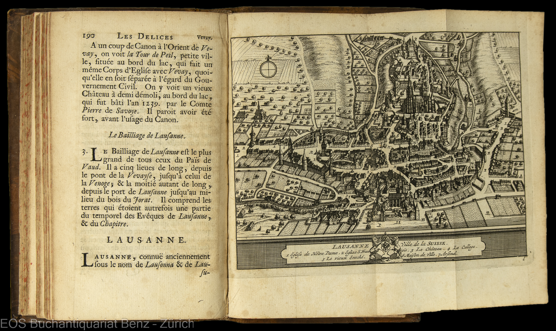 Ruchat, Abraham: Les délices de la Suisse, une de principales républiques de l’Europe. Ou l’on peut voir tout ce qu’il y a de plus rémarquable dans son pays & dans celui de ses alliez, qui composent avec elle le louable corps helvetique. Comme la description des villes, bourgs, châteaux, les antiquitez du pays & les raretez de la nature, la qualité de l’air & terroir, le naturel, les moeurs, & la religion des habitans, leurs gouvernemens différens, leur alliances ces mutuelles, & leur intérêts communs… Leiden, Pierre van der Aa, 1714. 4 Bände. Kl.-8°. (18) Bl., 220 (recte 224) S.; (2) Bl. S. 221–228, 233–434; (2) Bl. S. 435–676; (2) Bl., S. 677–1027. Mit gest. Titelblatt (doppelblattseitig), 1 gest. Frontispiz (doppelblattseitig), 68 (davon 50 gef.) und 5 (von 6) gef. Kupferkarten. Lederbände der Zeit mit reicher Rückenvergoldung.