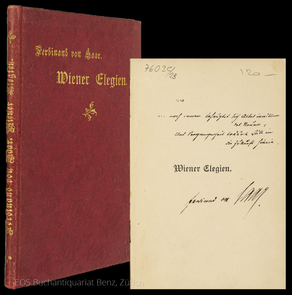 Saar, Ferdinand von: Wiener Elegien. Heidelberg, Georg Weiss, 1894. Dritte, durchgesehene Auflage. 8°. 47 S. Orig.-Leinenband.