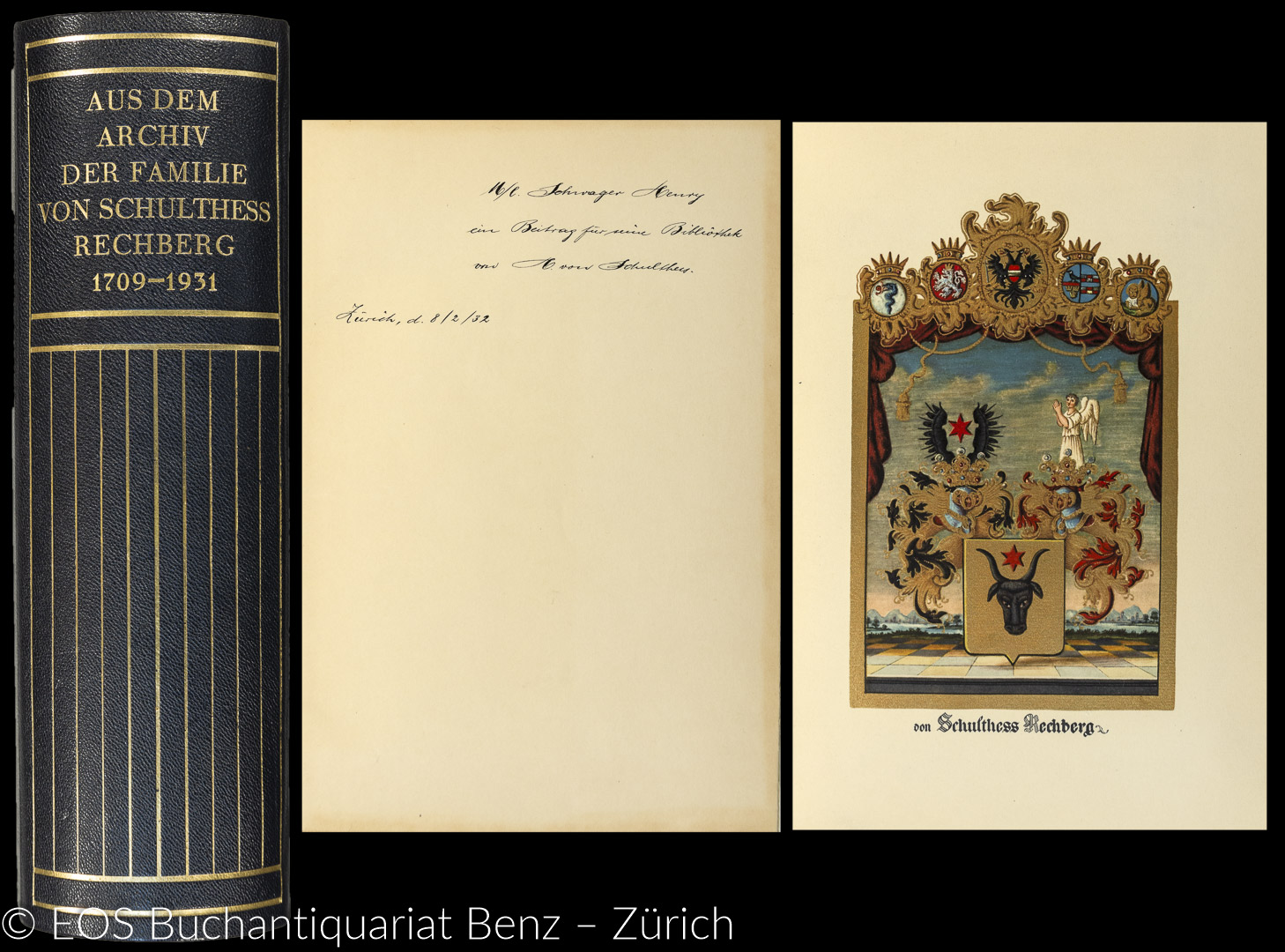 Schaufelberger, Rosa; Aus dem Archiv der Familie von Schulthess Rechberg 1709-1931. Brugg, Effingerhof A.-G., (1931). Farbigs Titelblatt, 585 S., mit einigen Illustrationen (teilweise in Farbe),, gealteten Tafeln (Stammbäume), 2 Stammbäume in der Beilage am Schluss des Buche. Lederband mit Goldfiletten und Rückbeschriftung