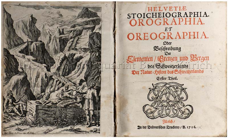 Scheuchzer, Johann Jakob: Helvetiae stoicheiographia. Orographia. Et oreographia. Oder Beschreibung der Elementen, Grenzen und Bergen des Schweitzerlands. Der Natur-Histori des Schweitzerlands Erster Theil. – Hydrographia Helvetica. Beschreibung Der Seen, Flüssen, Brunnen, Warmen und Kalten Bäderen und anderen Mineral-Wasseren Des Schweitzerlands. Der Natur-Histori des Schweitzerlands. Zweyter Theil. – Meteorologia et Oryctographia Helvetica. Oder Beschreibung Der Lufft-Geschichten, Steinen, Metallen und anderen Mineralien des Schweitzerlands, absonderlich auch der Uberbleibselen der Sündfluth. Ist der Dritte oder eigentlich der Sechste Theil der Natur-Geschichten des Schweitzerlands. Zürich, Bodmerische Truckerey, 1716-1718. 3 Teile in 1 Bd. Kl.-4°. (4), 268, (6) S.; (16), 480, (8) S.; (16), 336 S. Mit gest. Frontispiz; Tl. I: Tafeln I, II und V sowie 1 unn. Taf.; Tl. II: Tafeln I-XII plus 2 unn. gef. Tafeln zu Teil I gehörend (Bergsturz von Plurs); Tl. III: 17 unn. Tafeln (mit fortlaufend num. Abbildungen). Pergamentband der Zeit mit hs. Rückentitel, goldgepr. Wappensupralibros.